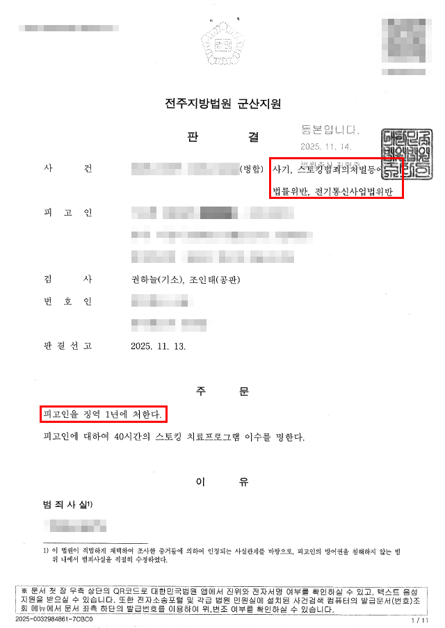 사기+스토킹 악질 범죄, 징역 1년 실형 선고