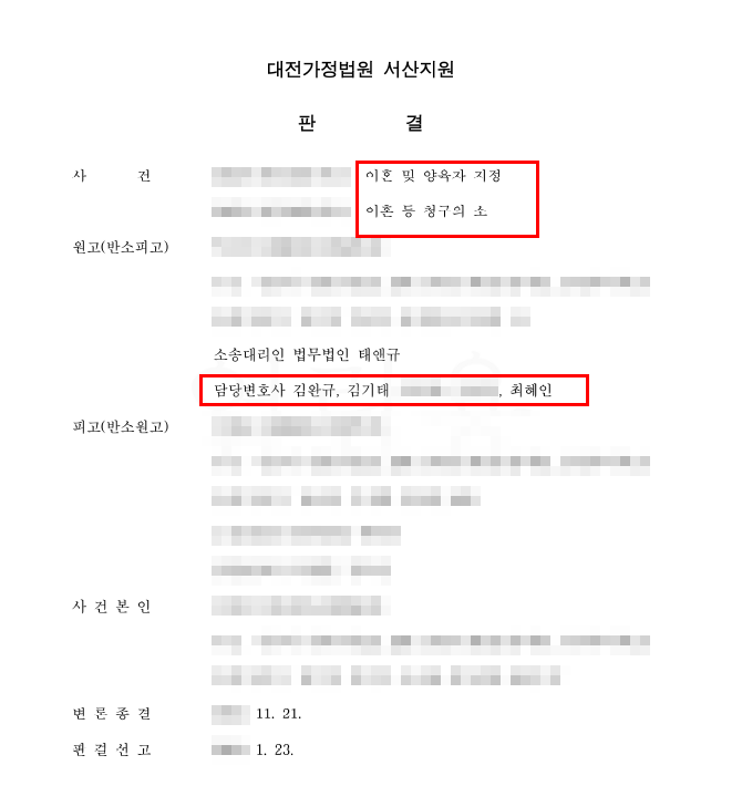 법원은 김기태 변호사의 치밀한 주장을 모두 인정했습니다. 상대방의 조건에 기가 죽어 눈물짓던 의뢰인께서, 당당하게 위자료를 받고 아이의 손을 꽉 잡은 채 새 출발을 하시게 된 정말 통쾌한 순간이었습니다.